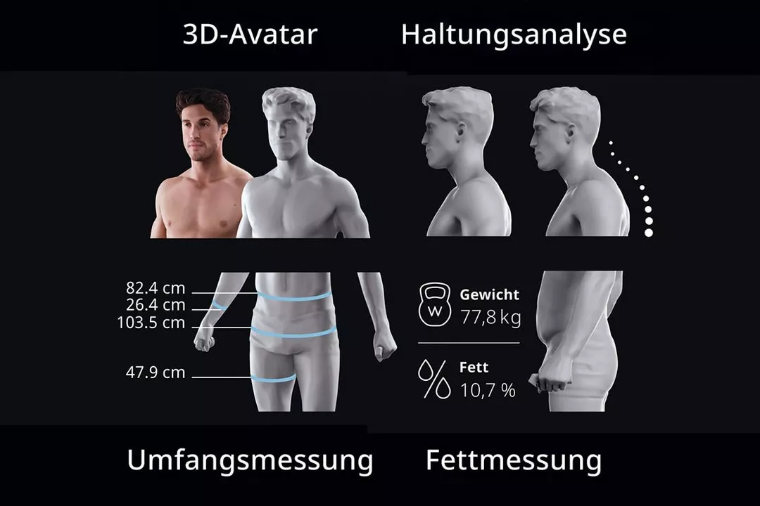 Der SCANECA (3D Körperscan) bietet dir eine hochpräzise Körperanalyse in nur wenigen Sekunden. Mit Hilfe moderner 3D‑Technologie erstellt SCANECA einen detaillierten 3D‑Avatar deines Körpers, analysiert deine Körperzusammensetzung, misst Körperumfänge und deckt Haltungsprobleme auf – ideal für Fitness, Gesundheit, Reha und Gewichtsreduktion.
